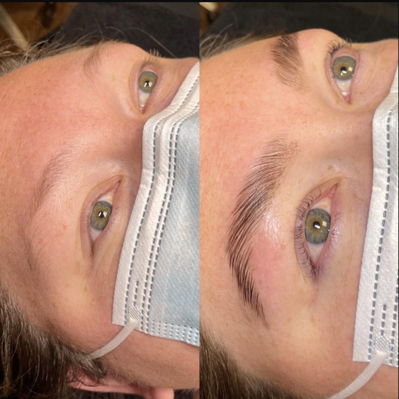 Close-up of a woman's eyebrow before and after microblading treatment showing fuller, well-defined eyebrows.