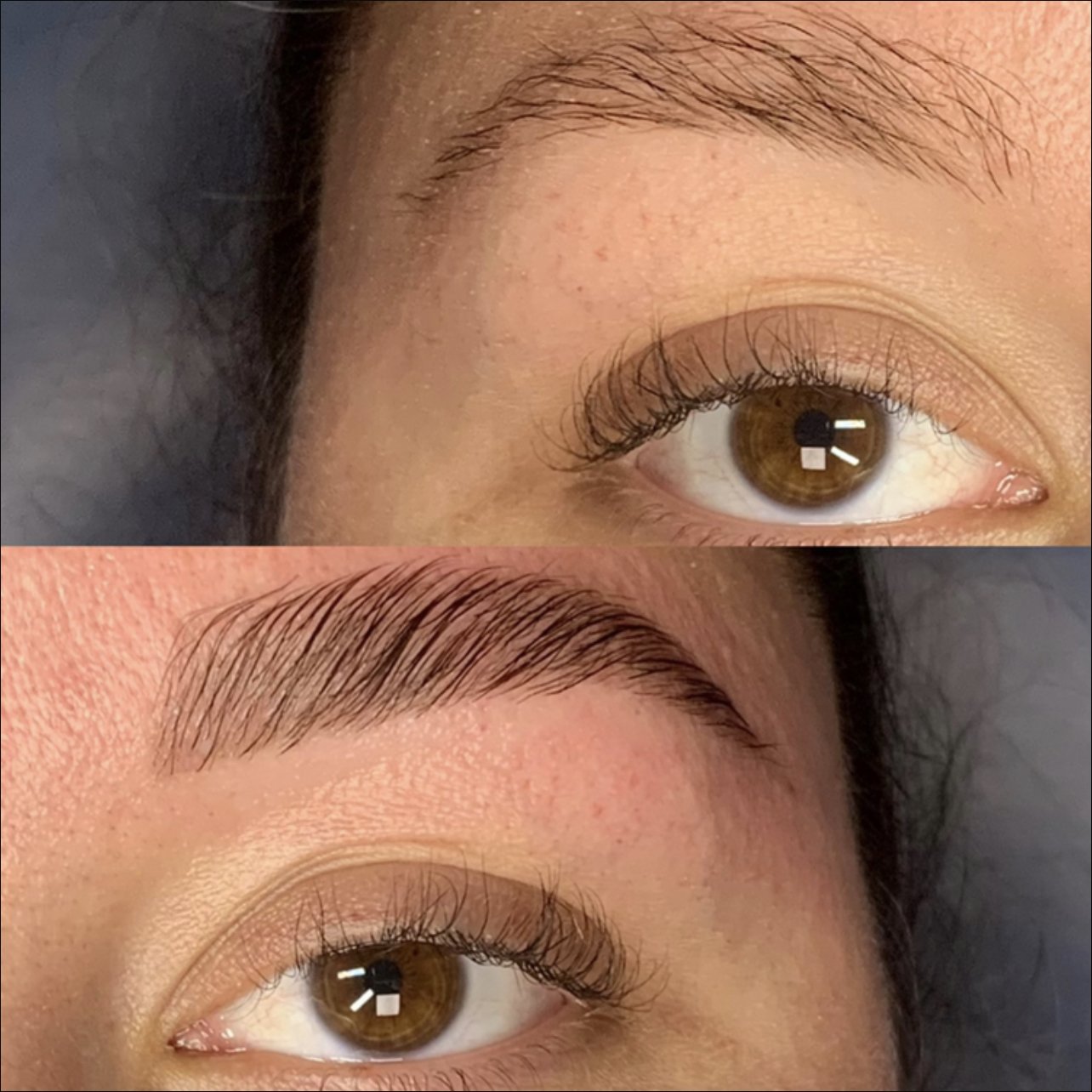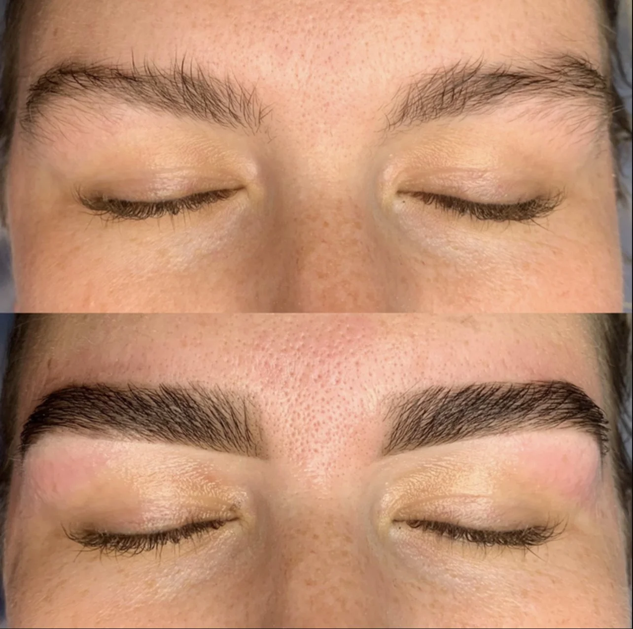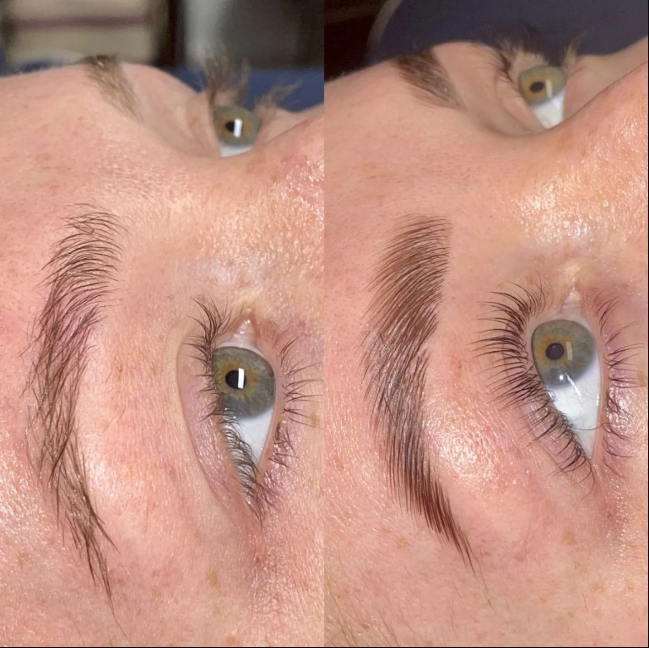 Comparison of eyebrows before and after microblading, showing fuller, well-defined eyebrows in the after image.