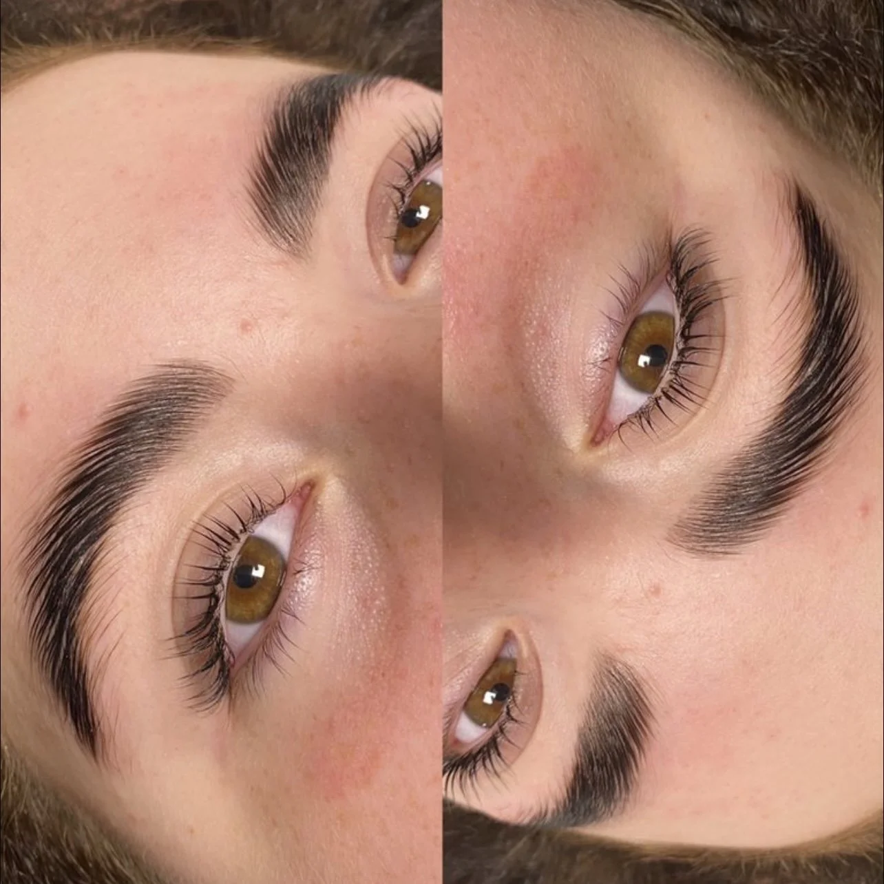Comparison of eyebrows before and after microblading treatment, showing fuller, well-defined eyebrows in the after image.
