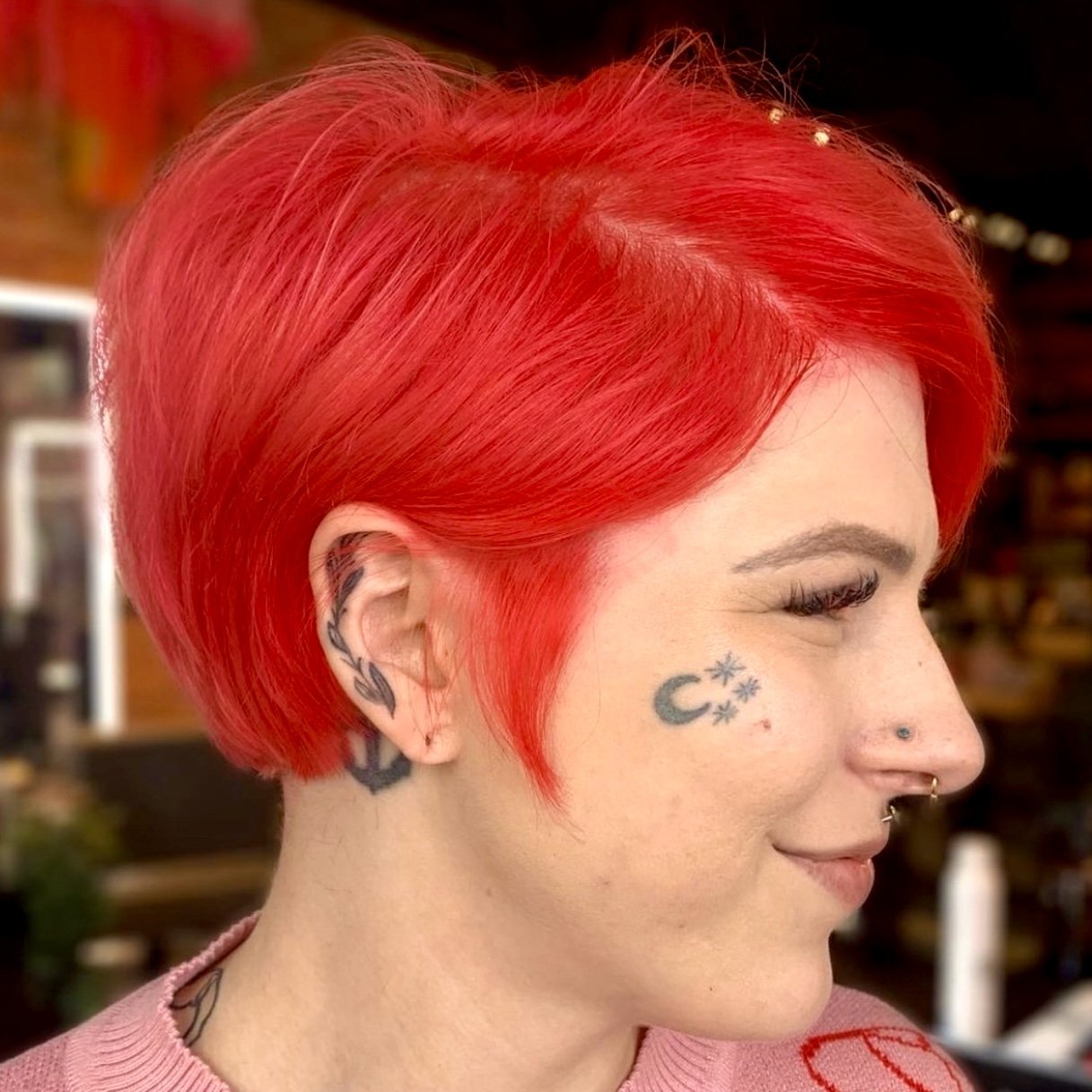 Side profile of a woman with vibrant red, short, layered haircut, wearing makeup and tattoos on her face and neck, smiling with eyes closed.