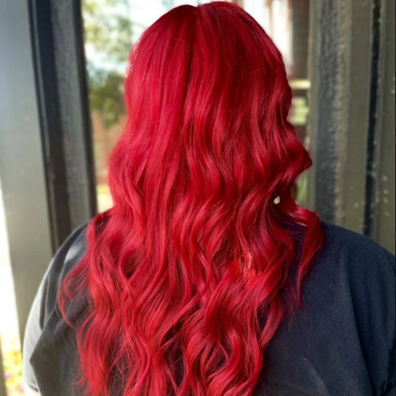 Wavy, shoulder-length hair dyed in shades of copper and auburn.