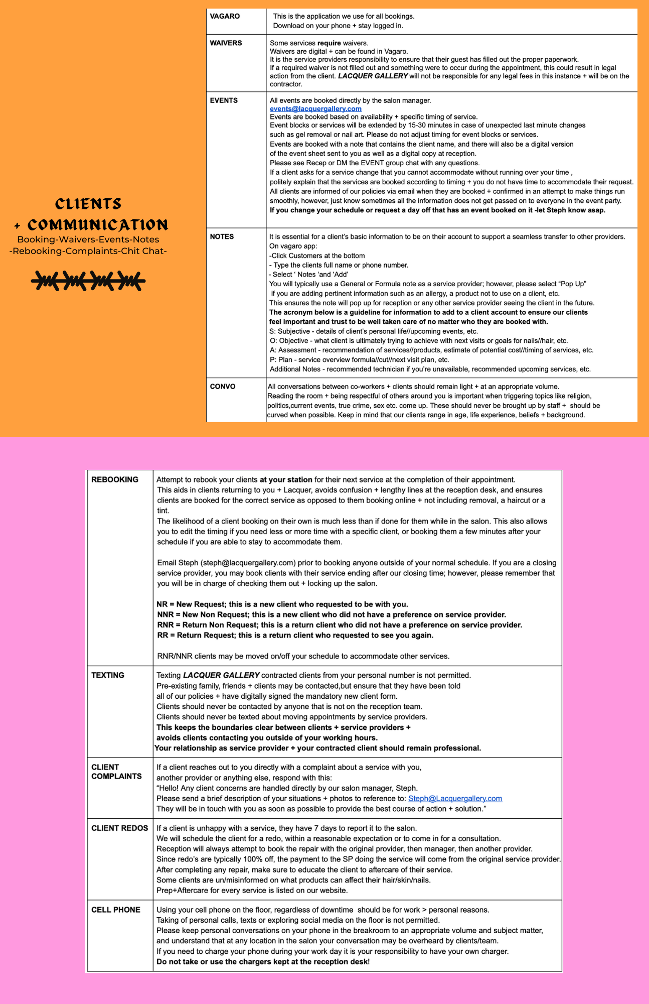 A set of guidelines and policies for client communication, rebooking, texting, client complaints, client redos, and cell phone use at a salon, displayed on a printed document with an orange and pink background.