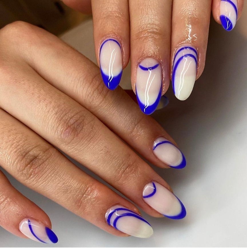 Hands with long, pointed blue and black marble-patterned nail polish and multiple rings on fingers.