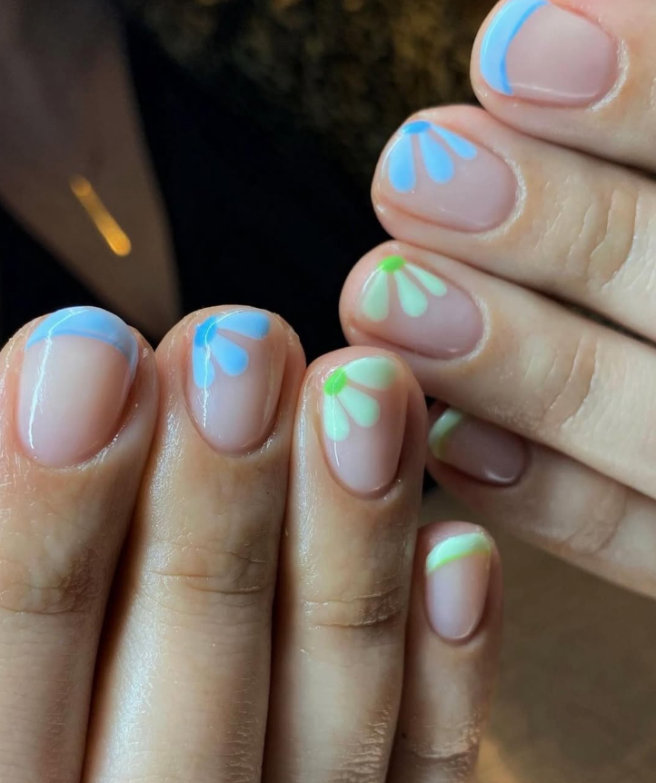 Close-up of nails with neon-colored flower petal nail art in blue and green on a natural nude base.