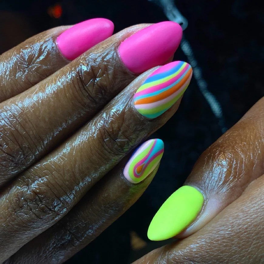 Close-up of a hand with colorful nail art, including pink, rainbow swirl, and neon yellow nails.