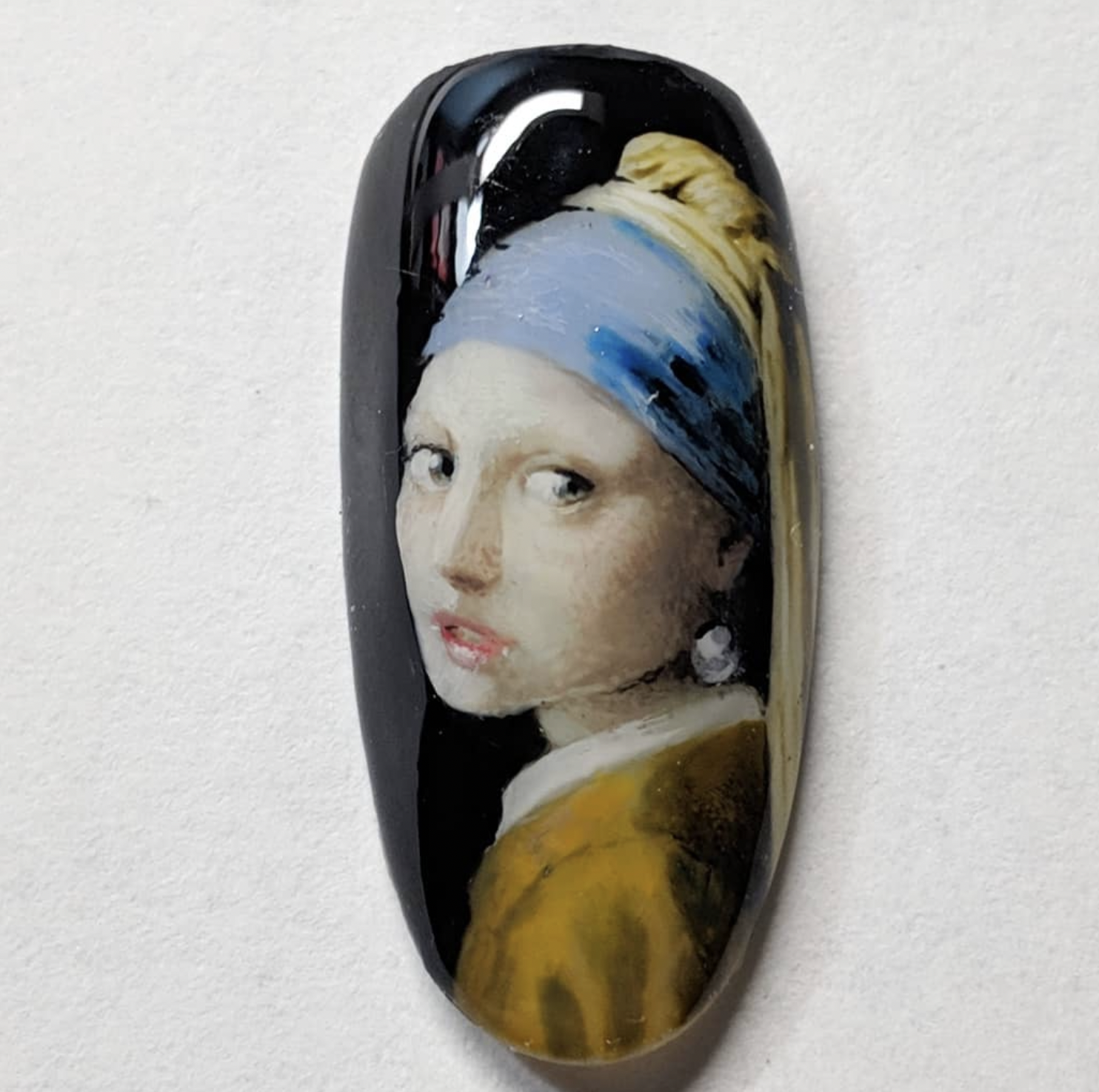 Decorative rock featuring a painted portrait of a woman wearing a blue and yellow headscarf and earrings.