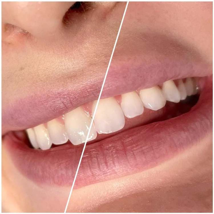 Comparison of teeth before and after dental cleaning and whitening, showing cleaner, whiter teeth after treatment.