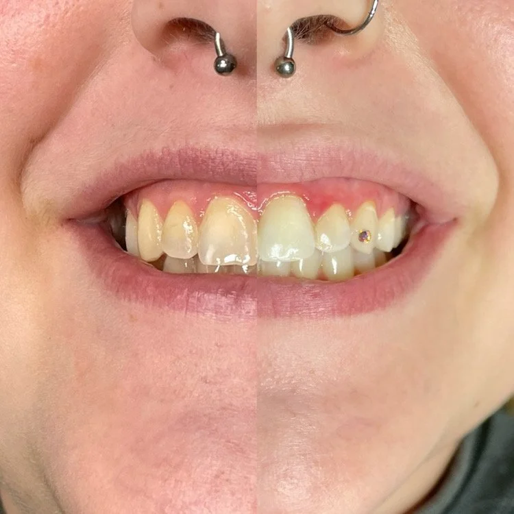 Close-up of a person's smile showing the upper front teeth with iridescent stickers on the two front teeth.